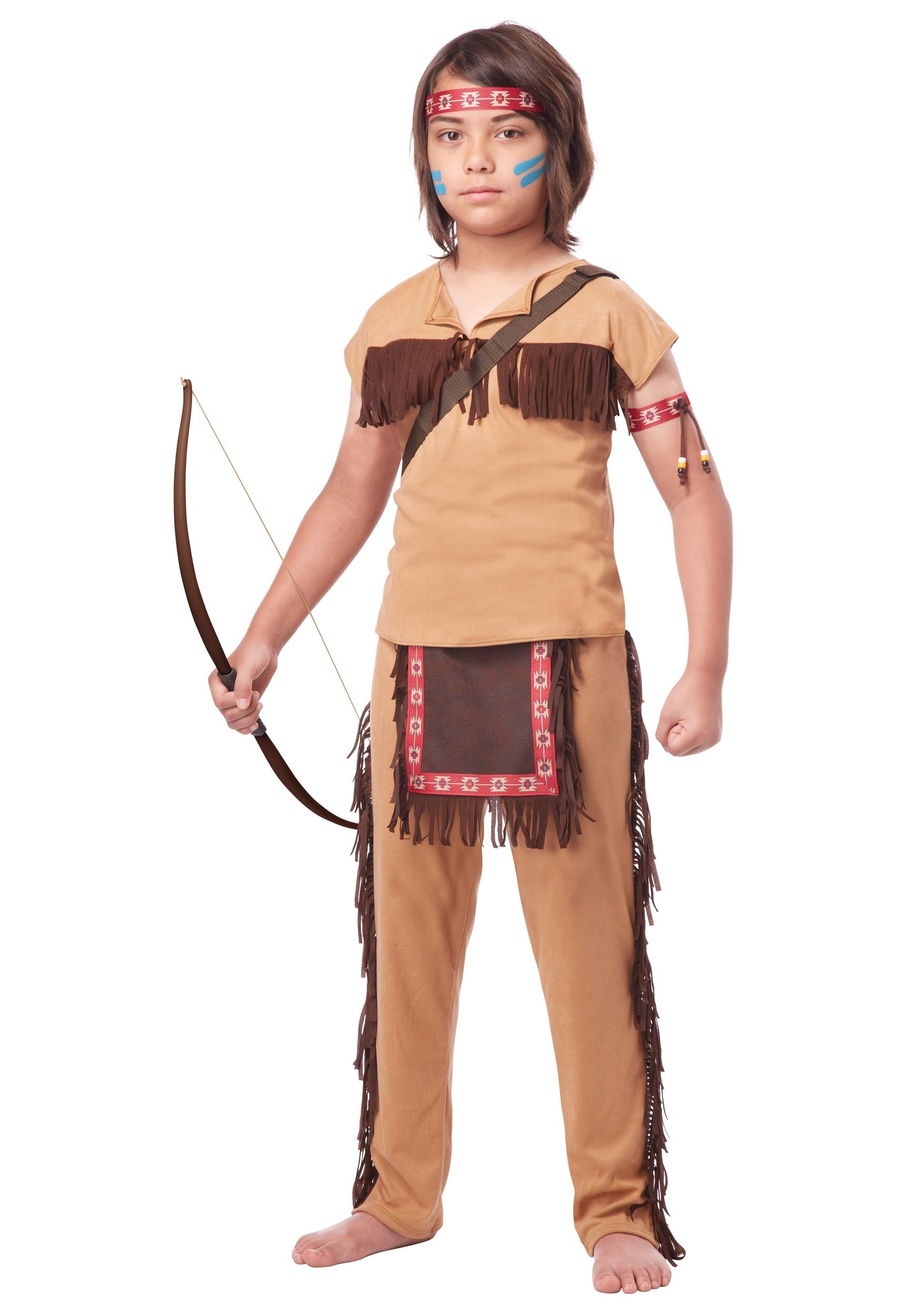 Детский костюм храброго индейца выполнен в светло коричневом цвете и включает в себя брюки с бахромой по бокам, рубашку, пояс темно-коричневого цвета с узорами, повязки на руки, а также узорчатую повязку на голову.