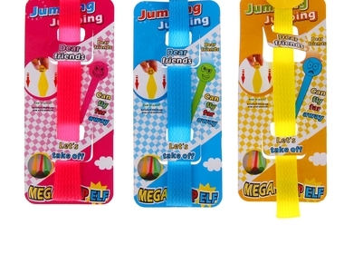Игрушка работает по принципу пружины: сожмите её в кулачке и резко отпустите — она выпрыгнет на ничего не подозревающего соседа. Или поставьте на ровную поверхность и действуйте по тому же принципу. Ребятишкам наверняка захочется устроить соревнование чья стрелялка подлетит выше!