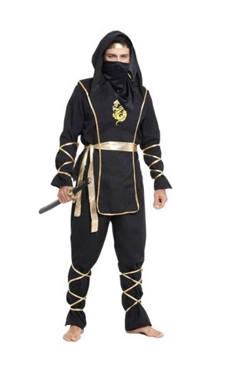 Костюм мастера ниндзя - роскошный костюм незаметного и быстрого воина. Костюм выполнен в черном и золотом цветах и включает в себя брюки, рубашку с длинными рукавами, накидку с драконом, головной убор, маску на пол-лица, пояс и тонкие ремешки для рук и ног.