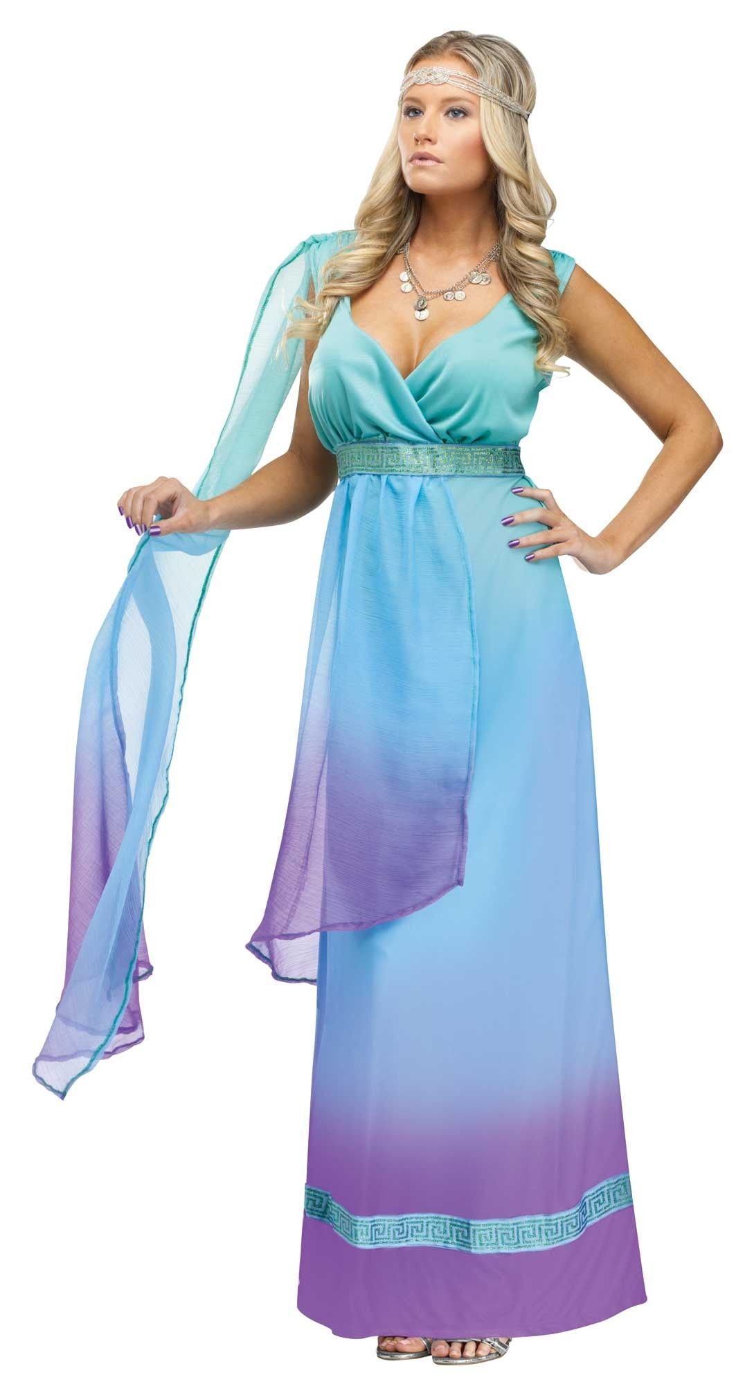 Костюм морской царицы - длинное легкое платье, выполненное в голубых и фиолетовых тонах. Платье на тонких бретельках. На одном плече легкая накидка. Платье украшает узорчатый пояс под грудью.