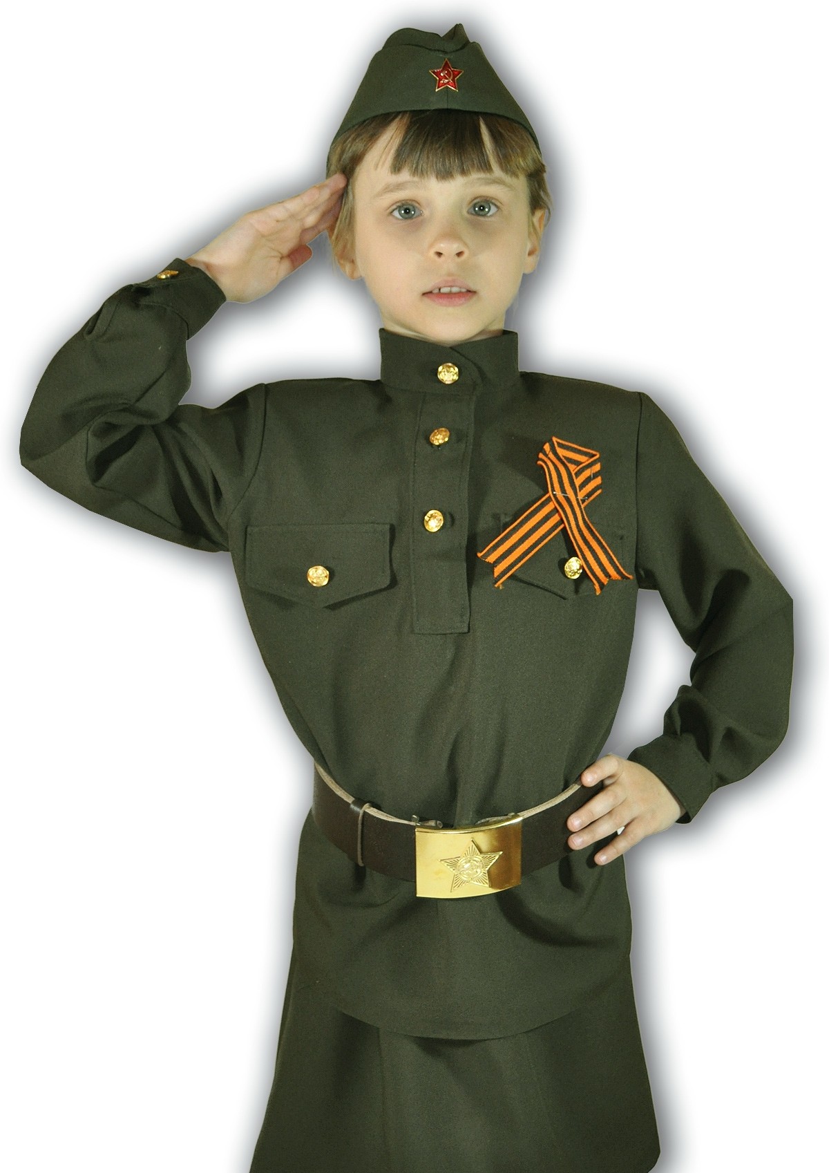 Детский костюм военной девочки подойдет для тематических праздников и мероприятий. Костюм выполнен в темно-зеленом цвете. В комплект входит военная шапочка со звездой, гимнастерка с воротничком на пуговицах, юбка, а также ремень с бляхой и ленточка.