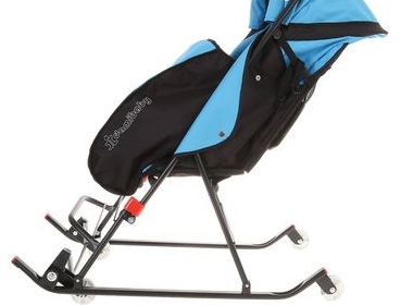 Санки Dami Baby предназначены для перевозки детей от 1 года до 4-х лет. Они оснащены регулируемой до положения «лёжа» спинкой, которая делает катание ребёнка более комфортным. Модель дополнена 4-мя колёсиками, что делает возможным её перемещение по асфальту и другому твёрдому покрытию. Санки оснащены тёплым чехлом для ножек. От осадков и ветра кроху защитит прозрачный тент, присоединяемый к козырьку. Санки компактно складываются и дома занимают минимум места.
