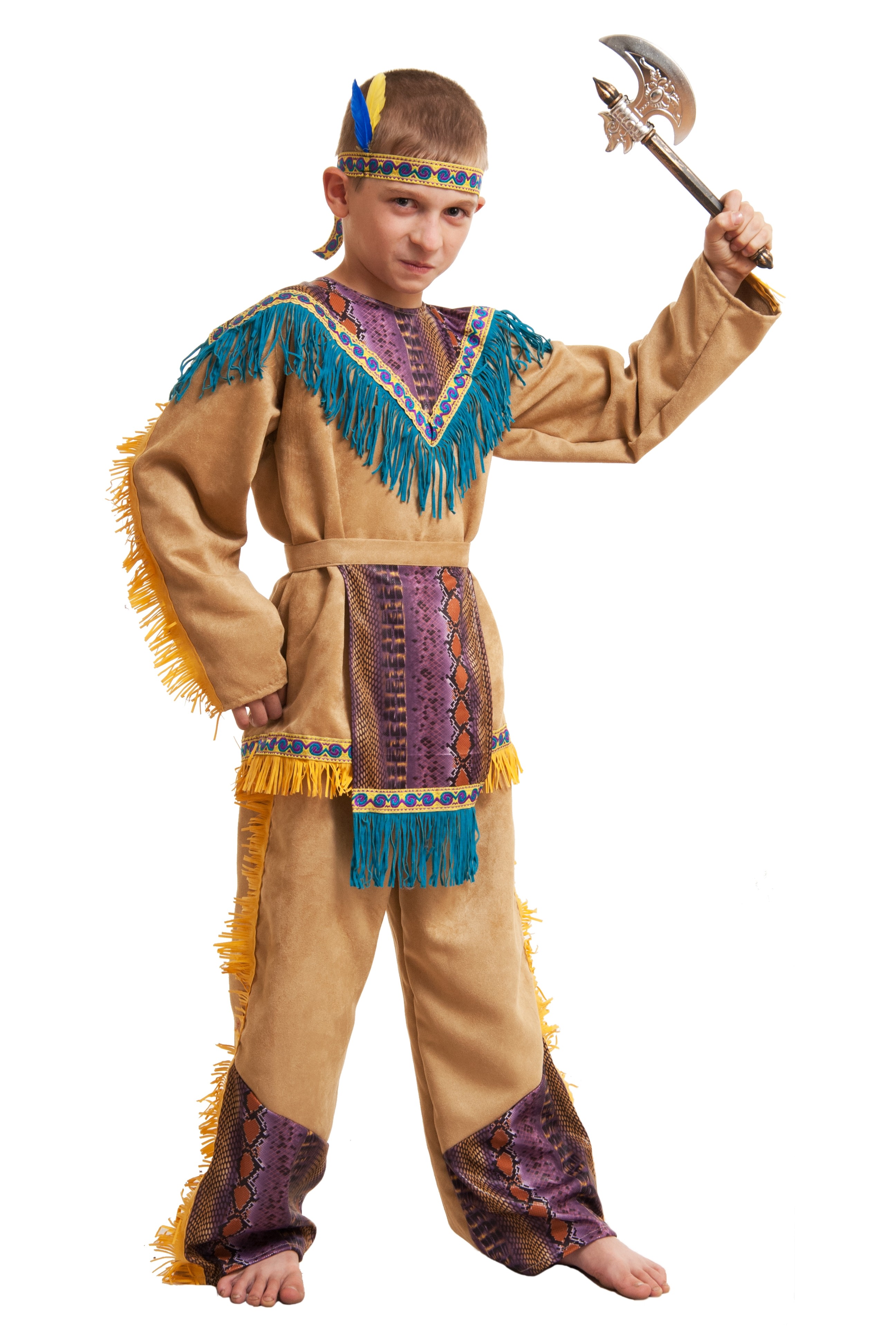 Костюм мальчика-индейца выполнен в светло-коричневом цвете и дополнен цветными вставками. В комплект входят штаны, рубаха с ярким воротником, цветной передник, а также повязка на голову, дополненная пером и небольшой топорик из пластикового материала.