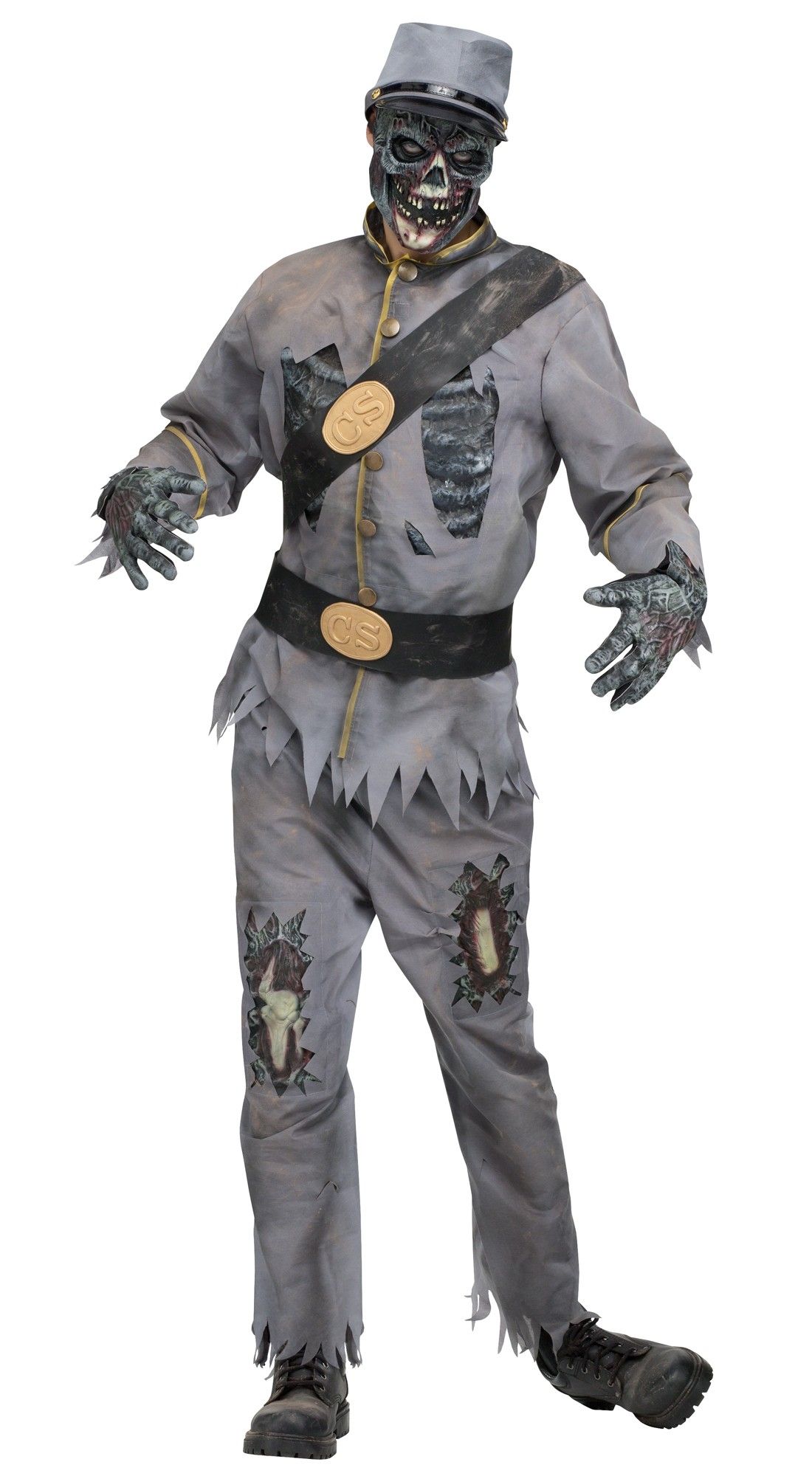 Костюм конфедерата Зомби включает в себя серый рваный жакет с пришитым патронташем, серые брюки с дырами, через которые виднеется плоть зомби, черный ремень с логотипом CS, серую шляпу конфедерата, перчатки в виде жутких рук зомби, а также жуткая маска зомби с кровавым подтеками.