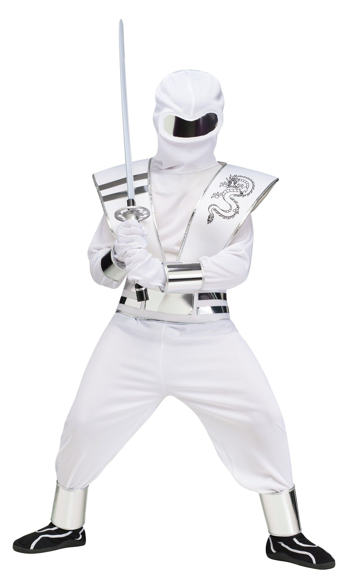 Детский белый костюм Ниндзя - белоснежный костюм с серебряной отделкой включает в себя кофту с длинными рукавами, свободные брюки, белые перчатки, тунику с серебряными узорами. Также в комплект входят зеркальные накладки на лодыжки, запястья и белый капюшон с зеркальной маской на глаза.