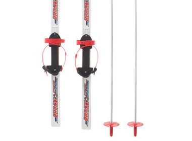 - Комплектация: пластиковые лыжи с полужёсткими креплениями и алюминиевыми палками в коробке;