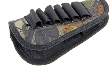 Камуфлированный патронташ используется для ношения на прикладе охотничьего ружья. Он имеет 6 карманов для 12–16 калибра, которые защищены 4 клапанами на пуклях. Крепится на пояс с помощью регулируемого ремня.