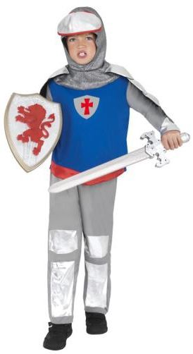 Костюм юного рыцаря включает в свой состав брюки с имитацией стальных накладок, тунику с гербом и шлем. Щит и меч можно купить у нас отдельно.