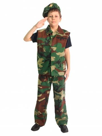 Костюм солдата выполнен из камуфляжной ткани. Жилетка застегивается на груди на липучку, беретка регулируется по ширине шнурком. Широкие брюки, собранные на резинку, не стесняют движения. Костюм Военного понравится будущим защитникам Родины. Рекомендуем дополнить костюм темными ботинками в цвет изделия и темной футболкой. [removed] [removed] [removed] [removed]
