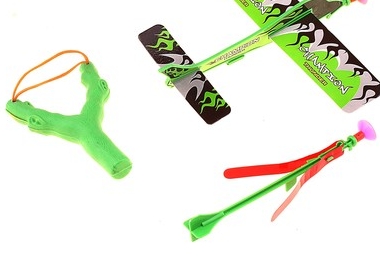Установите самолётик или стрелу в рогатку, натяните тетиву и отпустите. Снаряд взлетит, а достигнув цели, прикрепится в поражаемый объект благодаря присоске на конце.