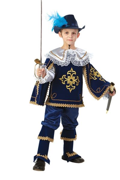 Этот прекрасный костюм отважного мушкетёра отлично подойдёт для мальчиков, которые любят приключения и готовые идти в любой бой! В комплект костюма входит красивая шляпа с пером, плащ синего цвета,штаны с сапогами и шпага для мужественного героя!